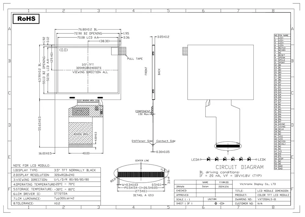 TFT-LCD on tyyppinen nestemäinen kidesinä, joka hyödyntää ohutkalvojen transistoritekniikkaa kuvanlaadun parantamiseksi, ja sillä on lukuisia sovelluksia jokapäiväisessä elämässä. Ammattimaisena TFT -moduulin valmistajana ja toimittajana Kiinassa tekee Victronix 3,5 tuuman 320 × 240 QVGA IPS TFT -moduulista, joka eroaa muista valmistajista? Ensinnäkin se tarjoaa tyypillisen kirkkauden 300 cd/m², leveät 80 ° katselukulmat kaikkiin suuntiin ja kontrastisuhteen 800: 1, mikä varmistaa erinomaisen luettavuuden eri kulmista. Toiseksi se integroi taustavaloyksikön, jossa käytetään 6s valkoista LEDiä, joiden käyttöikä on 30 000 - 50 000 tuntia (50%: n alkuperäinen kirkkaus), varmistaen selkeän näkyvyyden kaikissa valaistusolosuhteissa. Lisäksi se tukee RGB: n 24-bittistä rajapintaa ST7272A-ohjaimen kanssa. Lisäksi se läpäisee tiukan ympäristötestauksen, mukaan lukien lämpöisku (-30 ° C ↔ +80 ° C syklit), kosteuden varastointi (60 ° C/90% RH) ja mekaaninen tärinä, varmistaen, että se voi toimia saumattomasti pidennetyn lämpötila-alueen (-20 ° C- +70 ° C) yli.