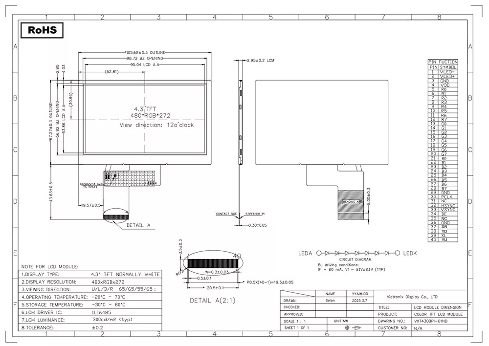 TFT-LCD on tyyppinen nestemäinen kidesinä, joka hyödyntää ohutkalvojen transistoritekniikkaa kuvanlaadun parantamiseksi, ja sillä on lukuisia sovelluksia jokapäiväisessä elämässä. Mikä tekee ammattimaisena TFT -moduulin valmistajana ja toimittajana Kiinassa, mikä tekee Victronix 4,3 tuuman 480 × 272 -teollisuuden TFT -moduulista erilaisen kuin muut valmistajat? Ensinnäkin se tarjoaa tyypillisen kirkkauden 300cd/m², leveän katselukulman 65 ° klo 12 suuntaan ja kontrastisuhteen 700: 1, varmistaen erinomaisen luettavuuden eri kulmista. Toiseksi se integroi taustavaloyksikön, jossa käytetään 7S1p-valkoisia LED-levyjä, joiden käyttöikä on 30 000-50 000 tuntia (50%: n alkuperäinen kirkkaus), varmistaen selkeän näkyvyyden kaikissa valaistusolosuhteissa. Lisäksi se tukee RGB -käyttöliittymää ILI6485 -ohjaimella. Lisäksi se läpäisee tiukan ympäristötestauksen, mukaan lukien lämpöisku (-30 ° C ↔ +80 ° C syklit), kosteuden varastointi (60 ° C/90% RH) ja mekaaninen tärinä, varmistaen, että se voi toimia saumattomasti pidennetyn lämpötila-alueen (-20 ° C- +70 ° C) yli.